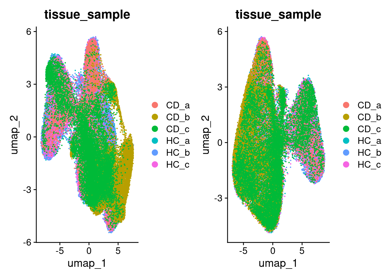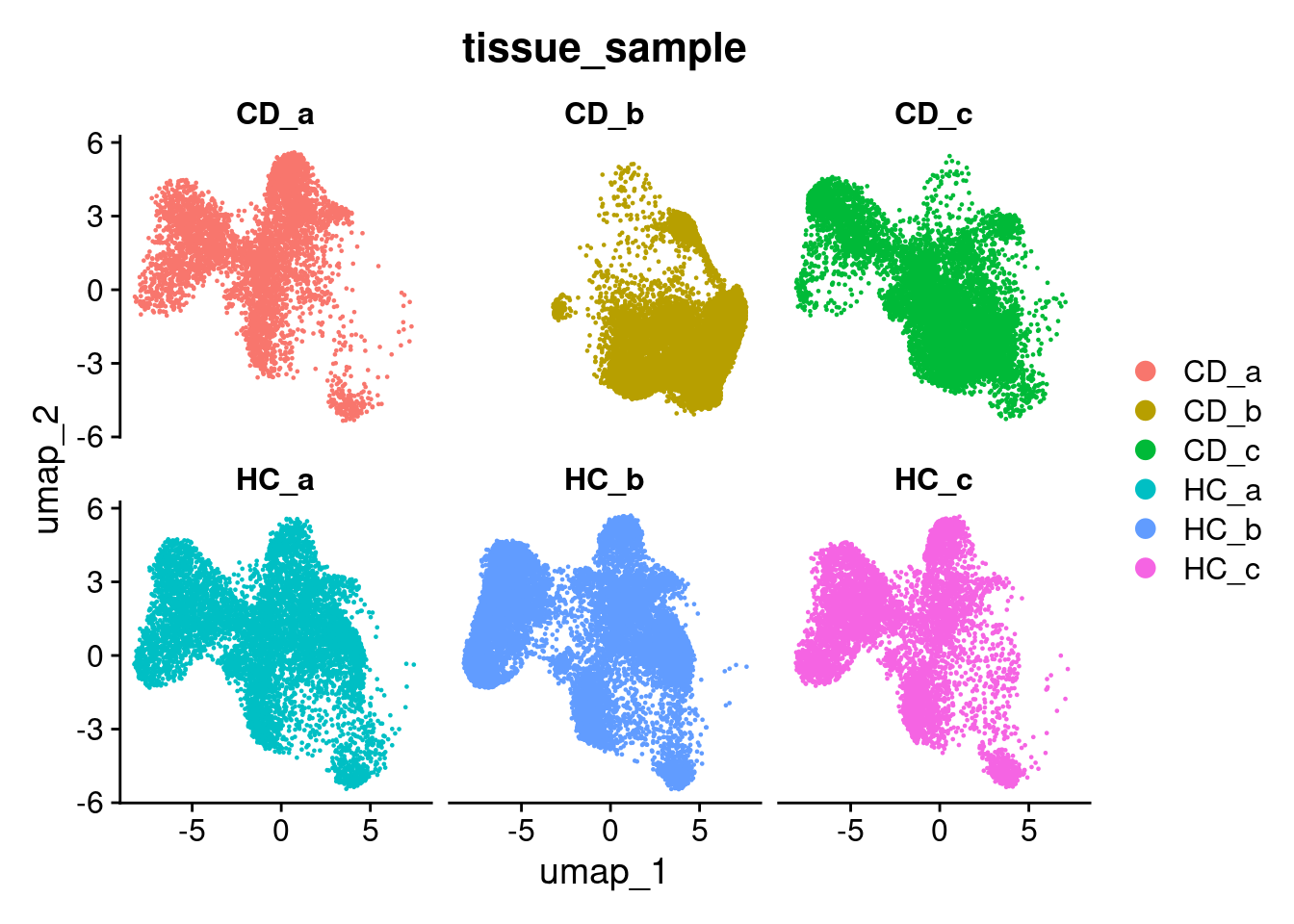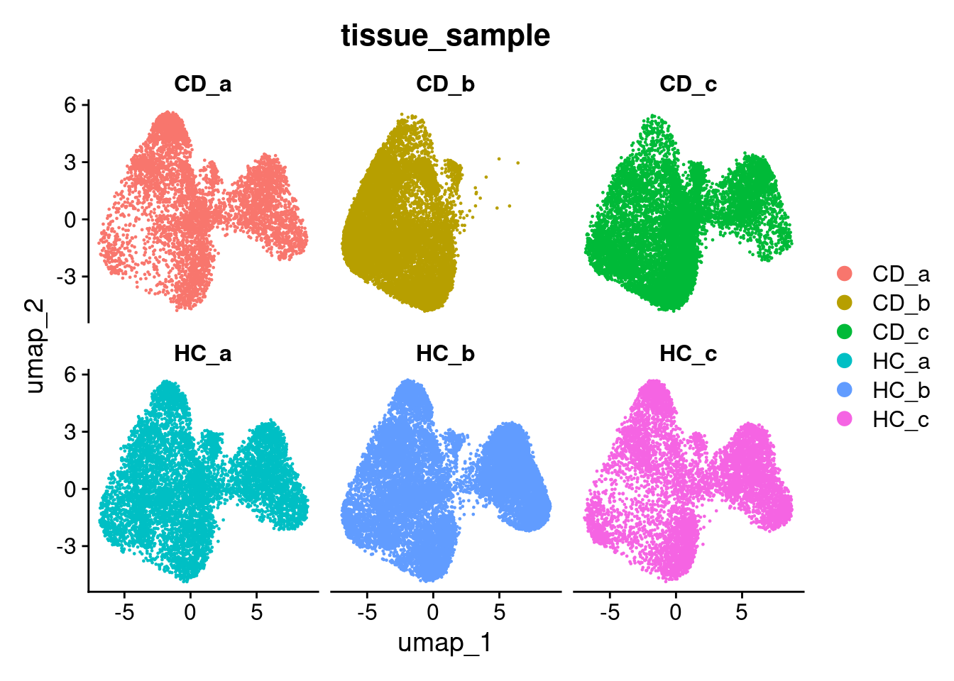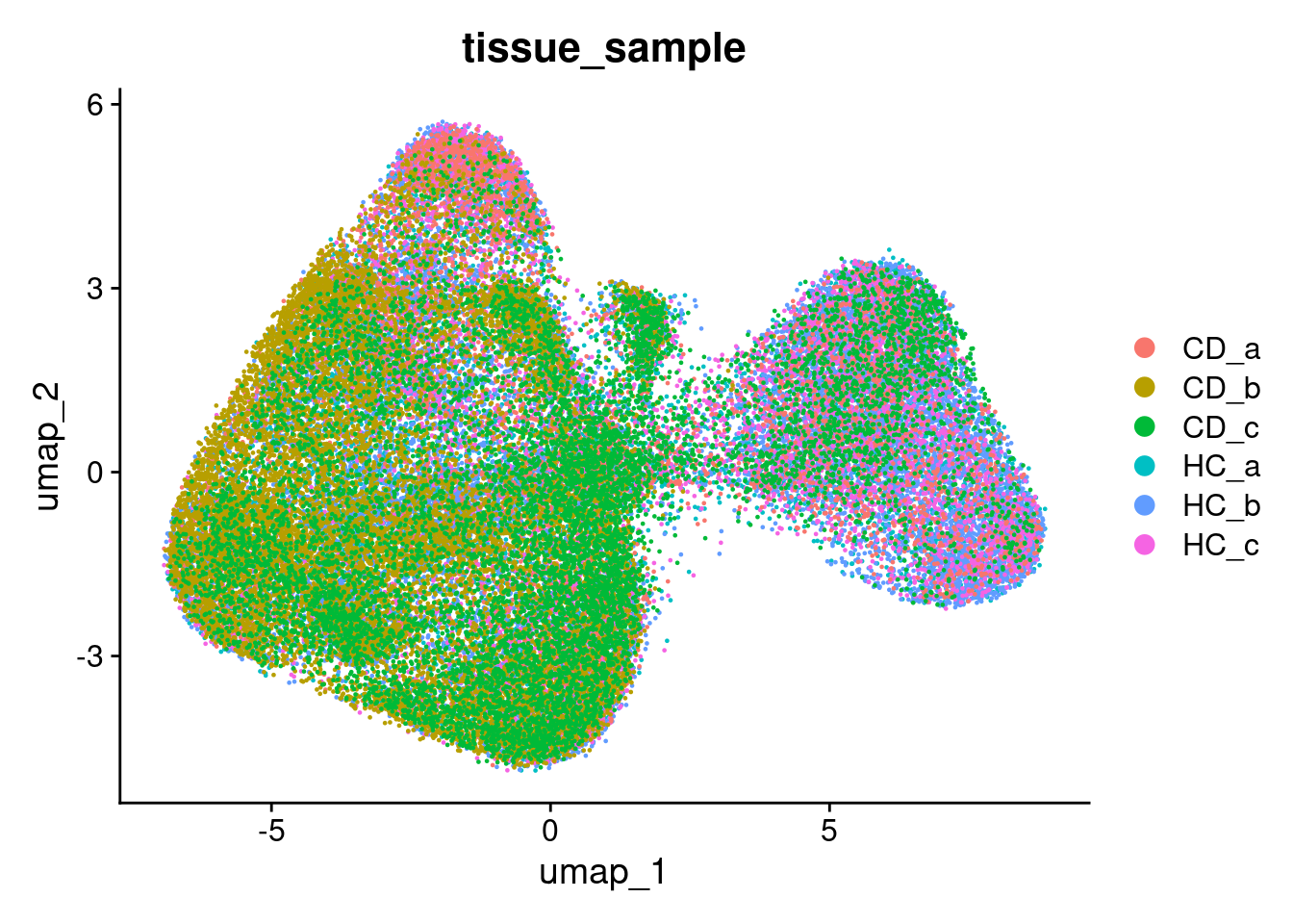 ##  6 spatial fields of view present: GSM7473682.HC.a GSM7473683.HC.b GSM7473684.HC.c GSM7473688.CD.a GSM7473689.CD.b GSM7473690.CD.cWhen plotting the new UMAP, the samples are move overlayed. Its a better visualisation, and means our clusters will not be biased to samples.