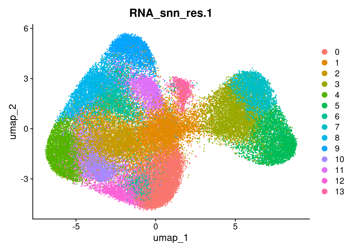 For the rest of the workshop, we’ll use stick with that resolution of 0.8 - which was actually the default. Because we ran that one last, it is stored in ‘seurat_clusters’