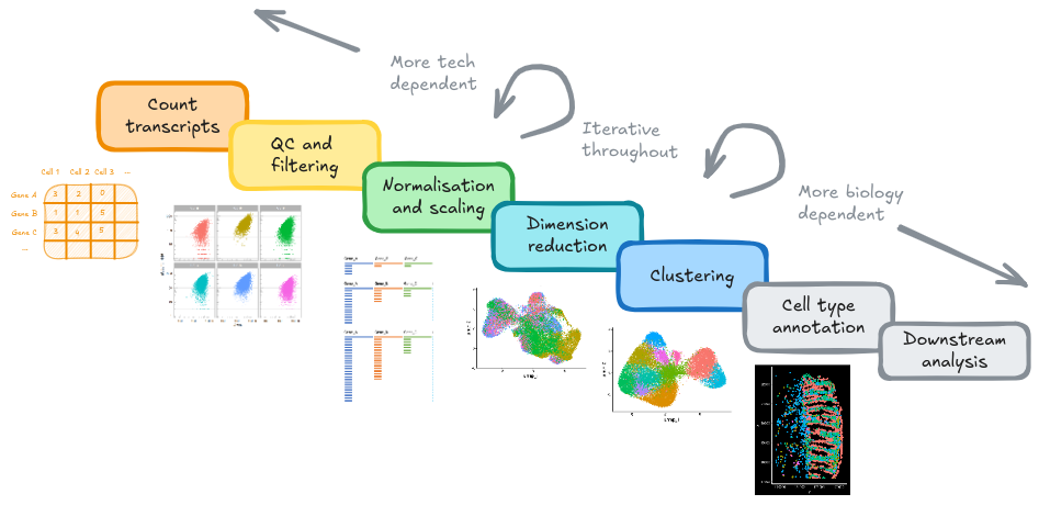 For an analysis, we will want to be able to examine different cell types or cell states in our data. Sadly the cells don’t come labelled, and ‘celltypes’ aren’t firm classifications anyway! But we can group together cells with similar expression profiles into ‘clusters’, which we can analyse.