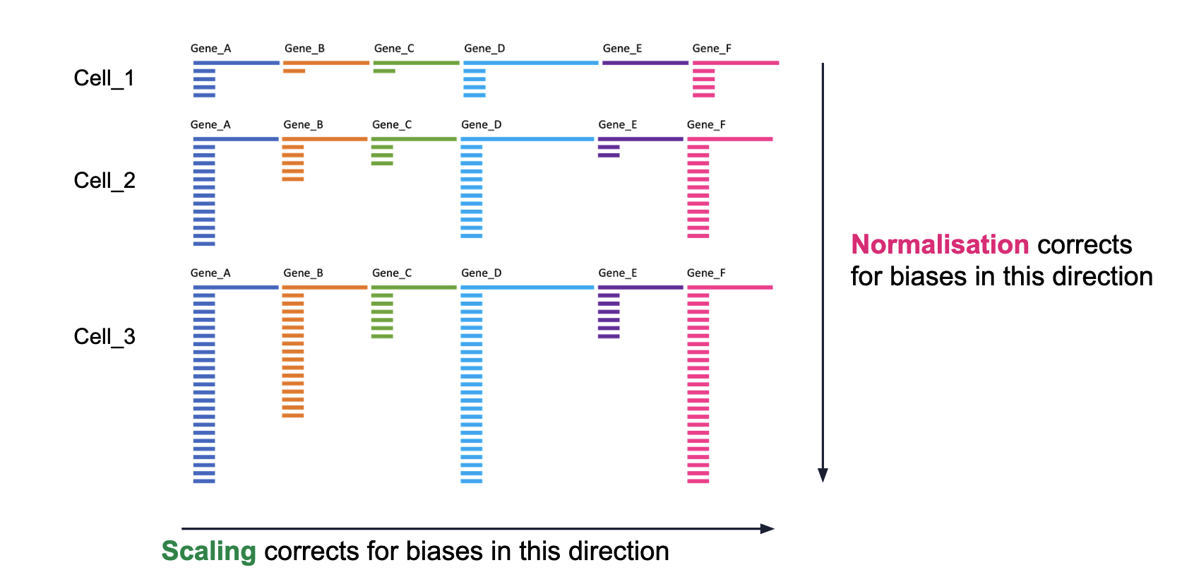 Normalisation: Different cells have different total target counts. Normalisation allows them to be comparable.
