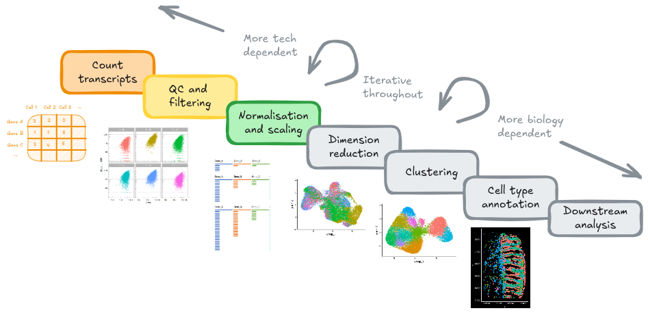 Normalisation and scaling are important processing steps when analysing transcriptomics data, particulary for single-cell RNA sequencing (scRNA-seq) and spatial transcriptomics (ST). They serve different purposes but both aim to adjust technical variation so that cells are comparable. This is important for accurate clustering and analysis tasks.