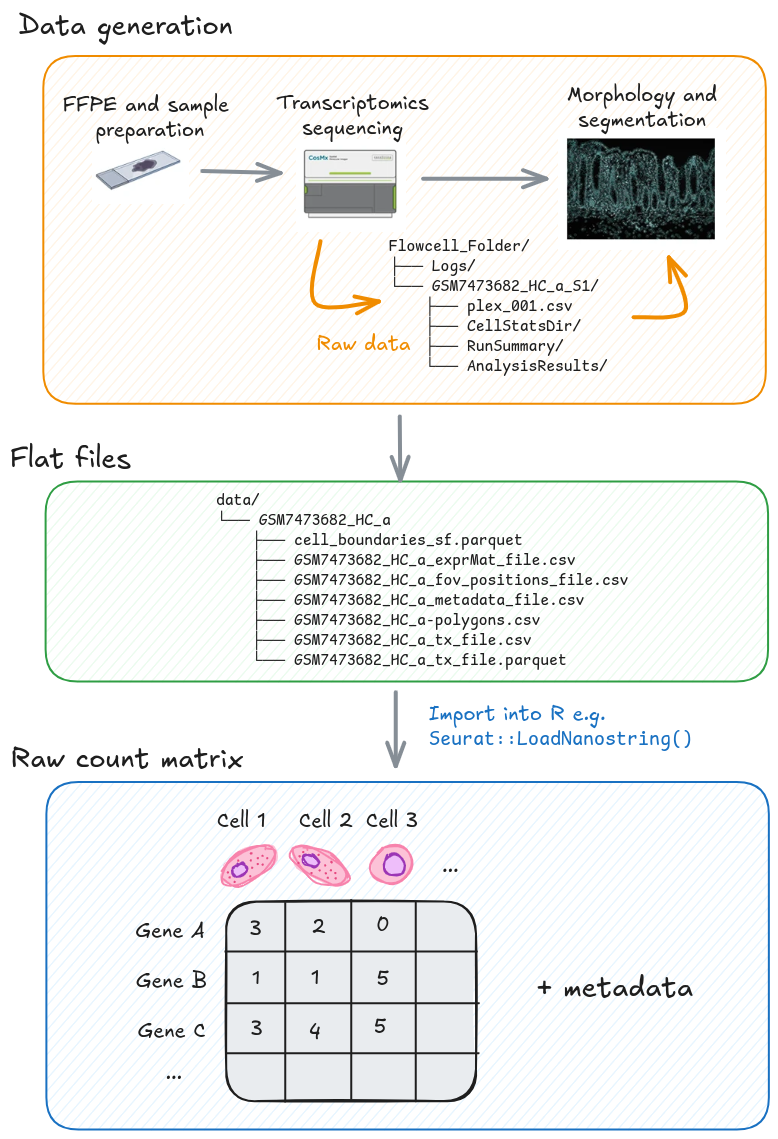 The files generated by high-resolution spatial transcriptomics platforms, such as the CosMx Spatial Molecular Imager (SMI), are typically categorised based on their processing stage. The Raw Files contain the primary output from the instrument’s run, necessary for decoding and spatial assignment, while the Flat Files represent the aggregated, cell-level data ready for statistical analysis in R or other environments.