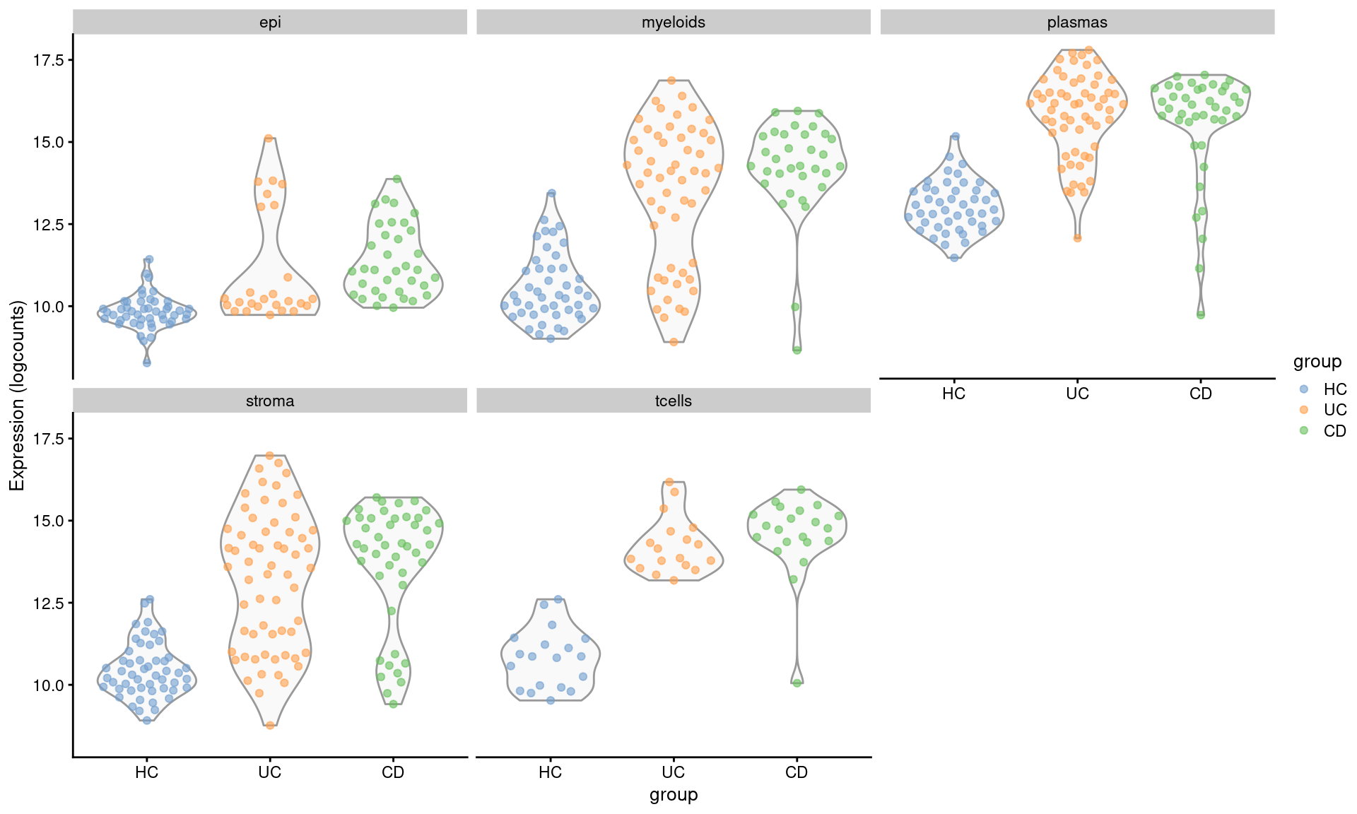 Note there are much fewer t-cells overall, but given that we have a high number of samples, there should still be enough to include. Its typical that some of the less common cell types are difficult or impossible to reliably test.